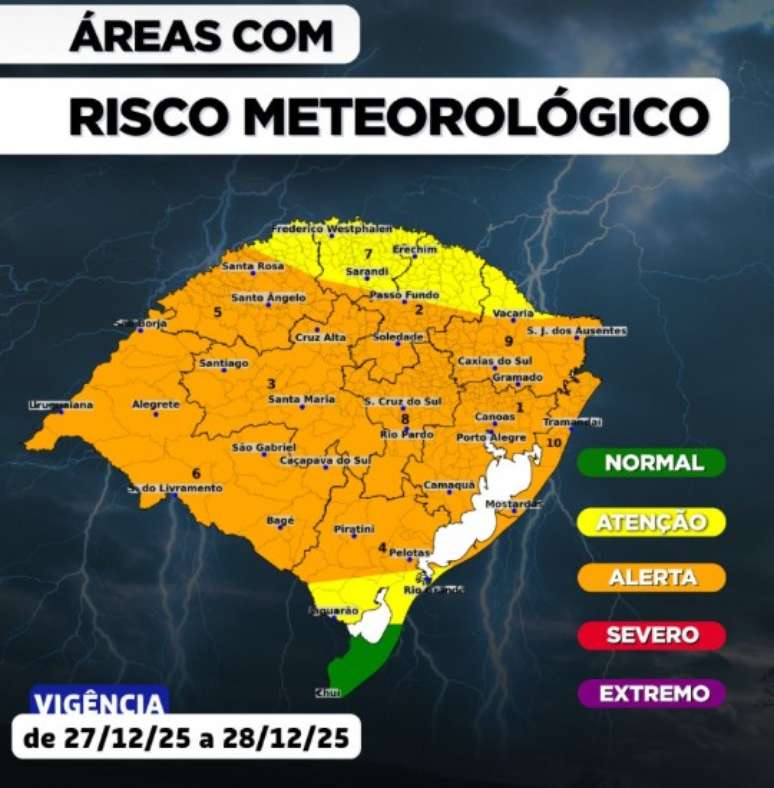 A Defesa Civil do Rio Grande do Sul emitiu um alerta para a atuação de uma frente fria sobre o Estado, que deve intensificar a instabilidade e provocar tempestades isoladas, com chuva forte a pontualmente intensa, queda de granizo e rajadas de vento que podem ultrapassar os 90 km/h entre este sábado (27) e domingo (28).