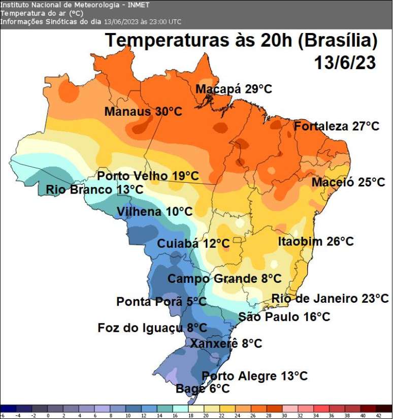 Temperatura no Brasil às 20h de 13/6/23: os tons em roxo, azul e verde indicam baixas temperaturas (Fonte: Inmet)