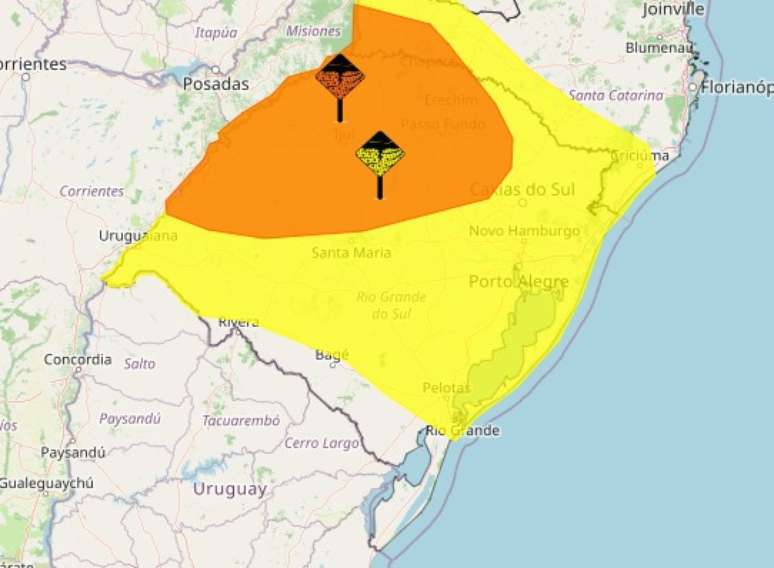 Para as demais regiões gaúchas, com exceção do Extremo Sul e parte da Campanha, o aviso é de perigo potencial, representado pela cor amarela. Nestes locais, a previsão indica chuvas de até 50 mm e ventos moderados entre 40 e 60 km/h. Embora o risco de estragos seja menor, ainda há possibilidade de queda de granizo e transtornos isolados.