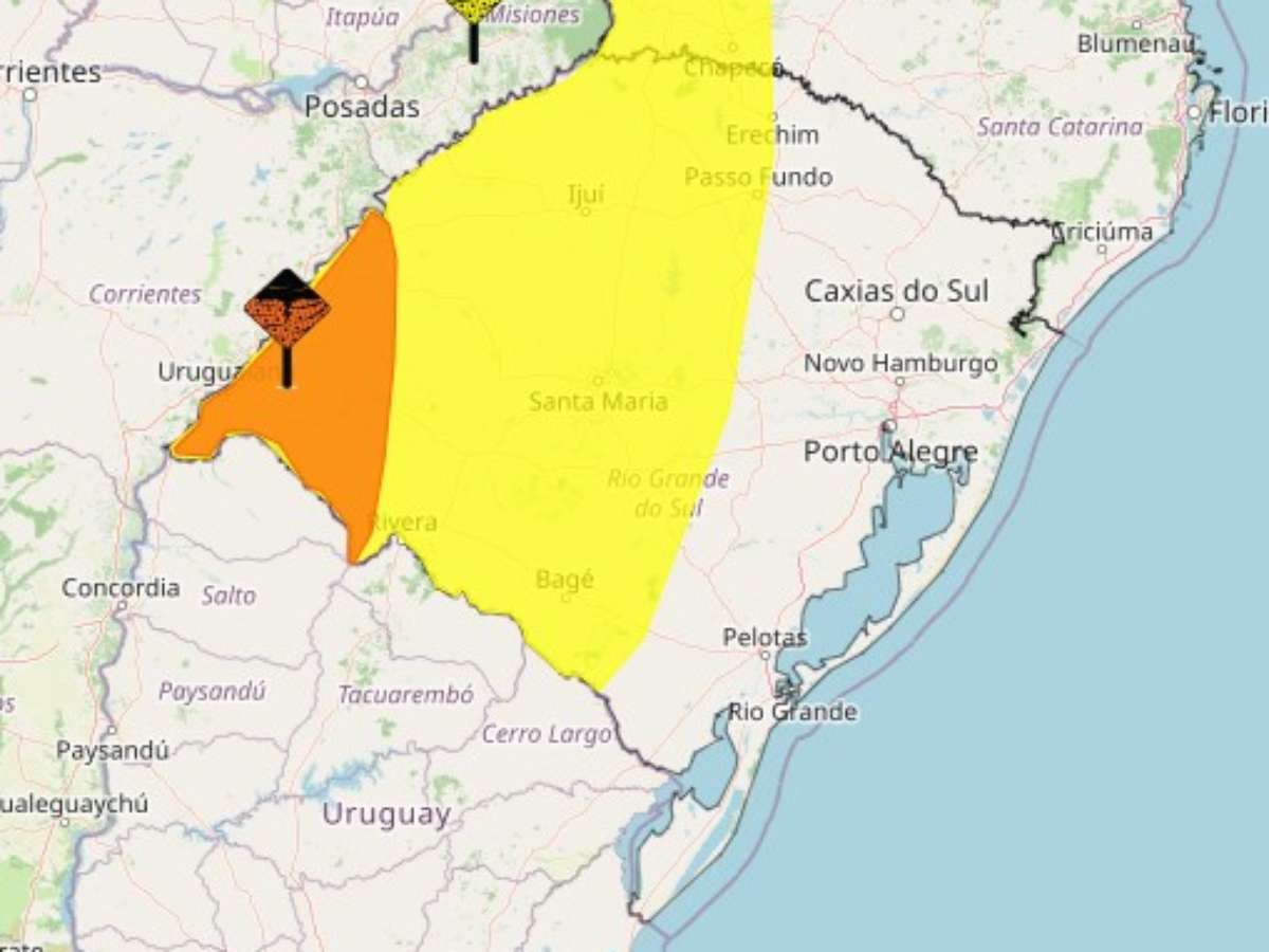 O primeiro aviso, de nível amarelo (perigo potencial), entra em vigor ao meio-dia desta terça-feira e se estende até o final da quarta-feira. Ele abrange toda a metade oeste gaúcha, incluindo as regiões Central, Norte, Noroeste e Campanha. Para essas áreas, a previsão indica chuva de até 50 mm por dia, ventos entre 40 e 60 km/h e possibilidade de granizo, com baixo risco de danos estruturais ou cortes de energia.