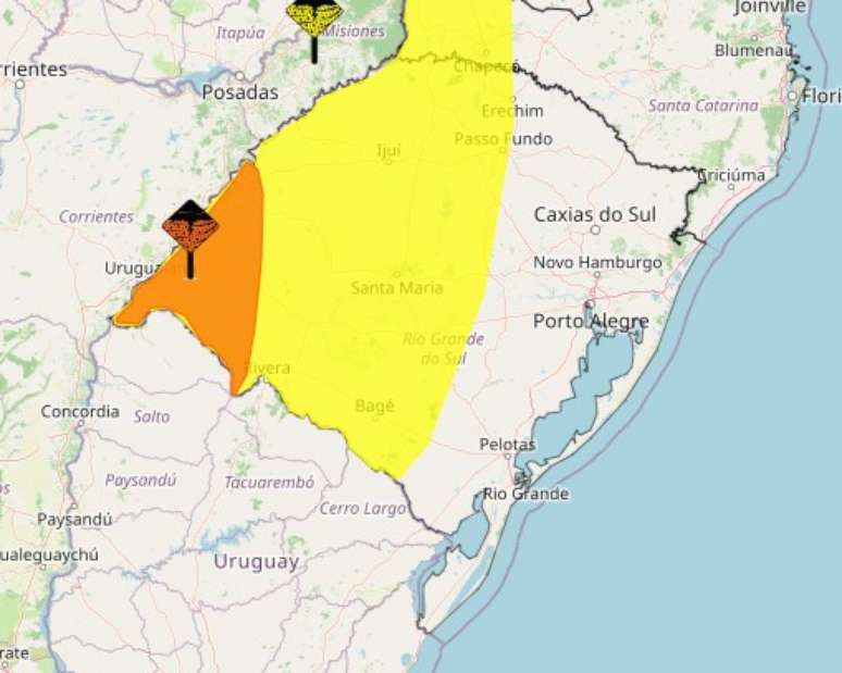 Já o segundo alerta é de nível laranja (perigo) e foca especificamente em parte da Fronteira Oeste a partir das 18h de hoje. Nesta região, o cenário é mais crítico, com acumulados que podem chegar a 100 mm por dia e rajadas de vento de até 100 km/h. Há risco real de alagamentos, queda de árvores e interrupção no fornecimento de eletricidade.