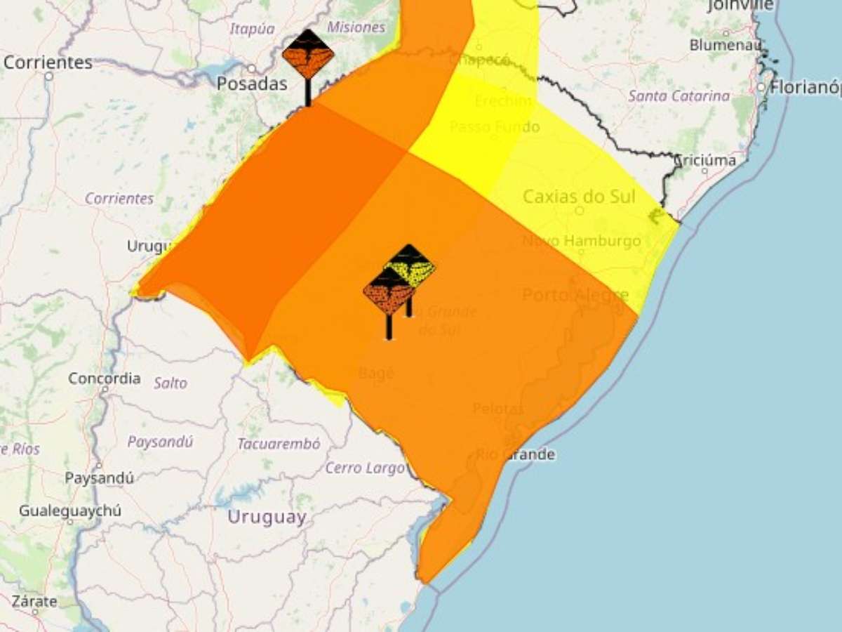 O Instituto Nacional de Meteorologia (Inmet) emitiu quatro alertas para o Rio Grande do Sul neste fim de semana, incluindo dois avisos de perigo (laranja) e dois de perigo potencial (amarelo), indicando condições de instabilidade em diversas regiões do Estado.
