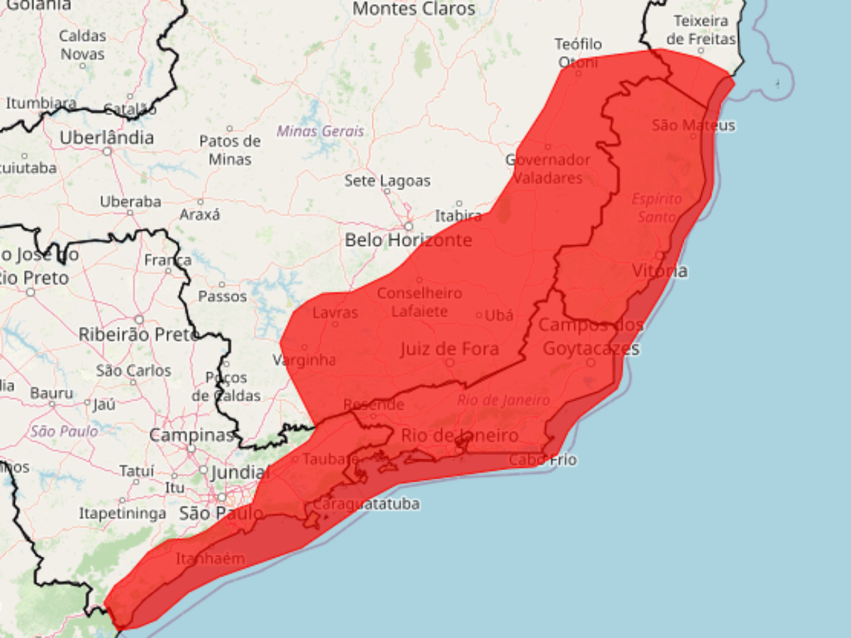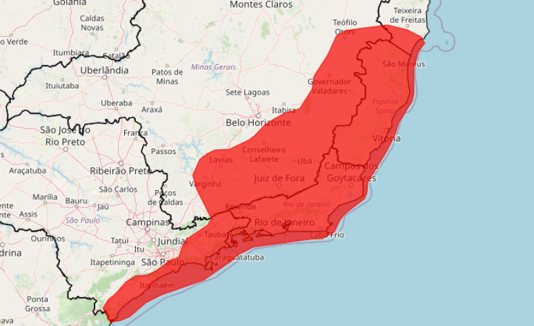 O Instituto Nacional de Meteorologia (Inmet) emitiu, na manhã desta terça-feira, 24, um alerta de "grande perigo" que abrange parte de Minas Gerais -- onde já ocorreram, até o momento, 23 mortes em decorrência de chuvas --, todo o Rio de Janeiro e o Espírito Santo, além do litoral de São Paulo.