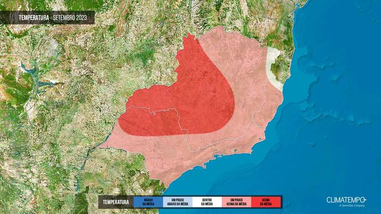 O último mês da estação, será com temperaturas altas e acima da média entre o norte de São Paulo e oeste de Minas Gerais, com calor aumentando ao longo do mês. Áreas mais próximas do Planalto Central tendem a ter períodos mais prolongados de calor intenso. Há