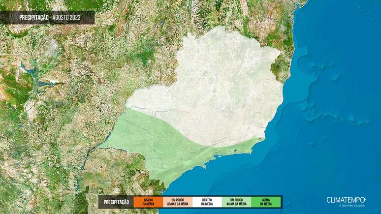 No centro-sul paulista, sul de Minas e do Rio de Janeiro, volumes de chuva um pouco acima da média, mas com a frequência da chuva aumentando entre agosto e setembro, mesmo assim, serão episódios eventuais.