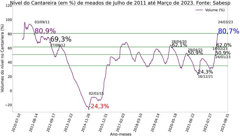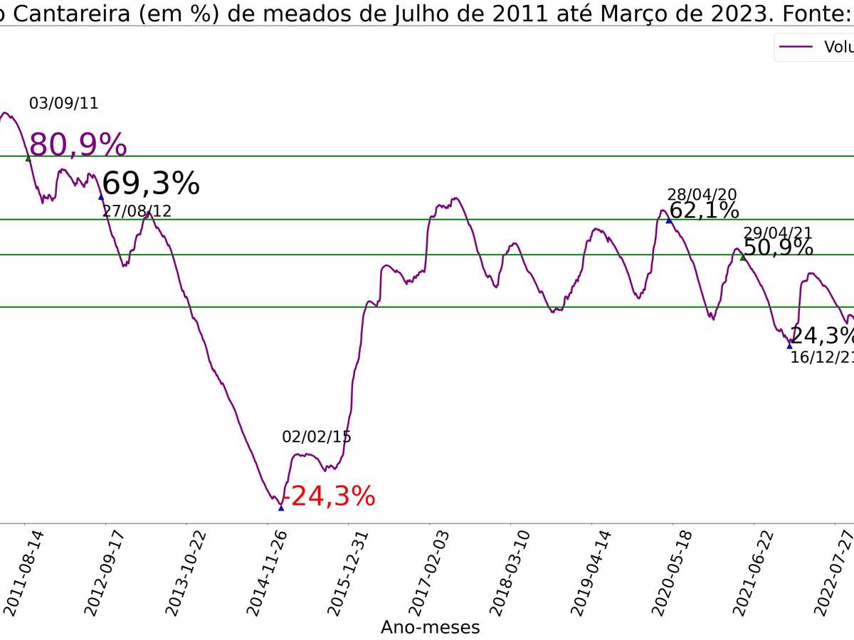 Nível do Sistema Cantareira de meados de julho de 2011 até março de 2023. Fonte: SABESP.