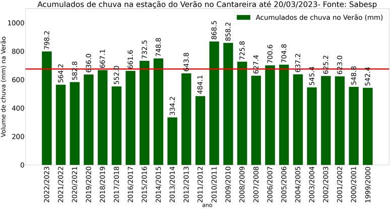 Acumulados de chuva entre janeiro e março dos anos de 2000 à 2023. Fonte: Sabesp.