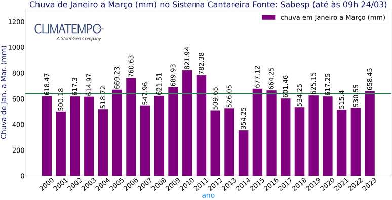 Acumulados de chuva para os meses de março entre os anos de 2000 e 2023. Fonte: Sabesp.