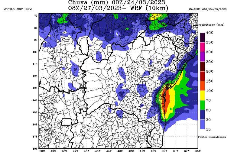 Acumulados de chuva previstos na Bahia entre os dias 24/03/2023 e a manhã de 27/03/2023. Fonte: Climatempo e pelo modelo numérico Weather Research and Forecasting (WRF) de 10km de resolução.