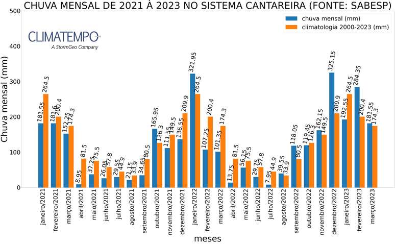De agosto de 2022 até março de 2023 a chuva ficou acima da média na maioria dos meses na região do Cantareira, com exceção apenas dos meses de outubro e de janeiro.