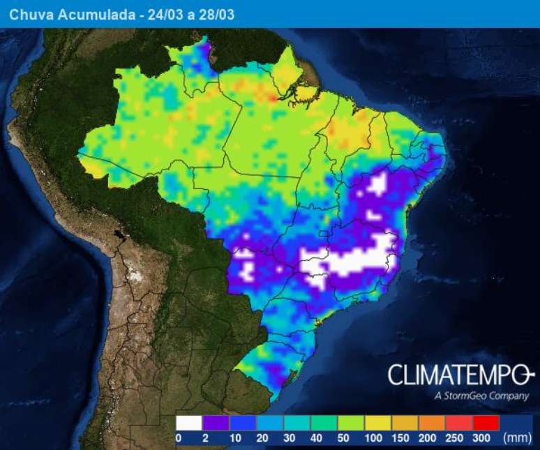 Estima-se que chova entre 20 a 80mm na média, até o dia 28 de março, terça-feira, podendo superar esse valor em pontos entre a Grande São Paulo e do Sul mineiro. Atenção para os temporais mais intensos e de chuva volumosa nesse período sobre o litoral paulista, com acumulados de chuva podendo chegar e até superar os 100mm, mesmo que em pontos isolados.