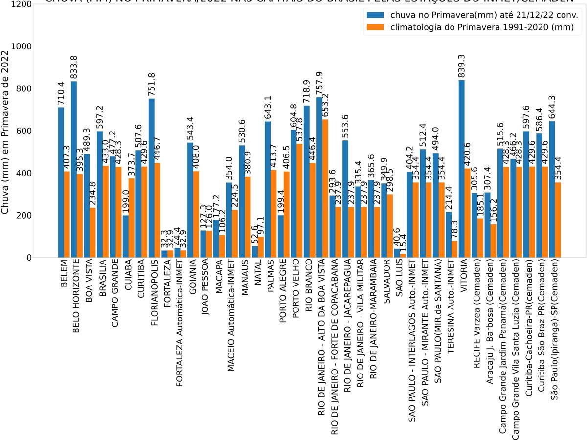 A maioria das capitais no Brasil registaram chuva acima da média na primavera de 2022. Destaque para Vitória(ES), Belo Horizonte (MG), Florianópolis(SC) e no Alto da Boa Vista, na cidade do Rio de Janeiro, com mais de 750mm na primavera.