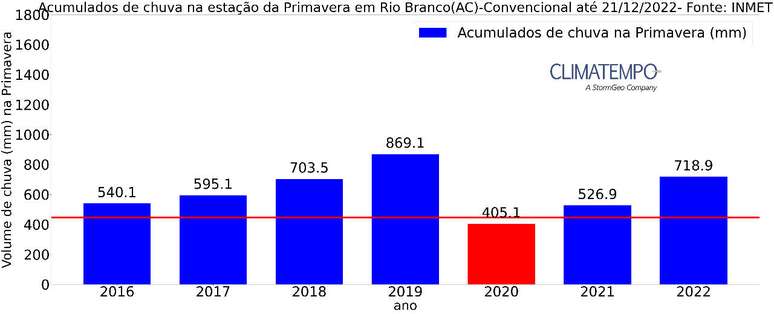 Em Rio Branco (AC) choveu 718,9mm na Primavera de 2022, ficando bem acima da sua média, e sendo a primavera mais chuvosa dos últimos 3 anos desde 2019, quando acumulou 869,1mm. Fonte: Estação convencional do INMET.