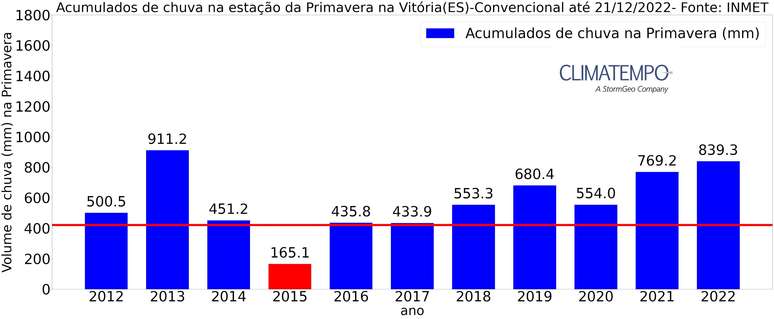 Vitória(ES) registrou 839,3mm nesta primavera de 2022, pela estação convencional do INMET. Estando 99,5% acima da sua média (420,6mm). Assim, a primavera de 2022 na capital capixaba ficou sendo a mais chuvosa dos últimos 9 anos, desde 2013, quando registrou 911,2mm.