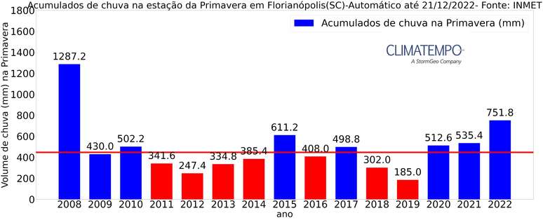 Florianópolis(SC) registrou 751,8mm nesta Primavera de 2022, pela estação automática do INMET. Ficando 68,3% acima da sua média (446,7mm). Assim, a primavera de 2022 na capital catarinense ficou sendo a mais chuvosa dos últimos 14 anos, desde 2008, quando acumulou 1287,2mm.
