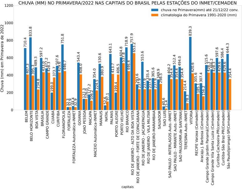Acumulados de chuva na Primavera de 2022 (entre 22/09/22 e 21/12/22) sobre as capitais no Brasil. Fonte:INMET/CEMADEN.