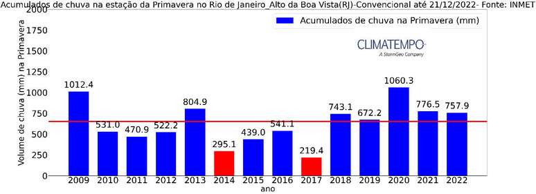 Mesmo a primavera de 2022 no Alto da Boa Vista no Rio de Janeiro (RJ) registrar o menor volume de chuva dos últimos 3 anos, desde 2019, quando registrou 672,2mm, é importante mencionar que a faz 5 anos seguidos que as chuvas ficam acima da média na primavera no Alto da Boa Vista. E a 3 anos seguidos que as primaveras choveu mais de 750mm no Alto da Boa Vista, na cidade do RJ.