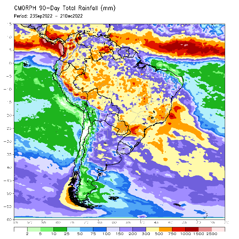 Precipitação em mm no Brasil entre 23/09/2022 e 21/12/2022, pela estimativa de Satélite, no Canal Micro-ondas. Fonte:NOAA.