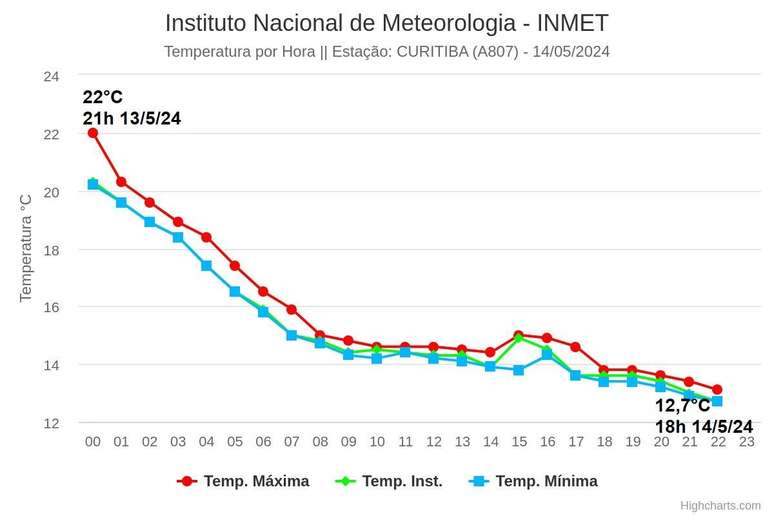 O gráfico mostra que a temperatura mínima por volta das 6 horas era de 14,3°C e às 18 horas de 12,7°C. A tendência de declínio persistiu e a temperatura às 22 horas chegou aos 12,4°C.