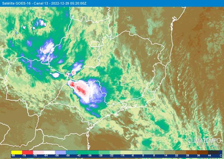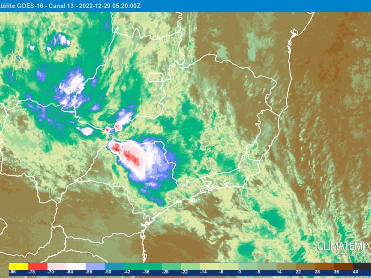 Nuvens carregadas da ZCAS sobre SP em 28/12/2022. As manchas em vermelho representam nuvens com maior potencial para temporal.