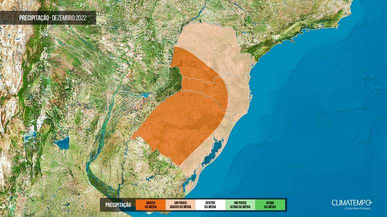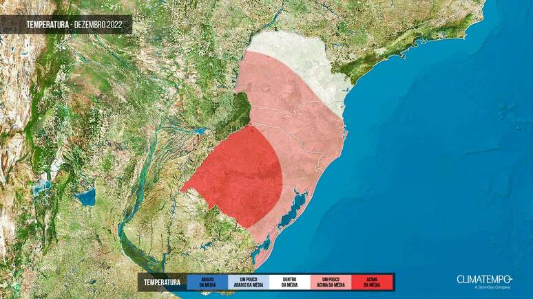 Dezembro: volume de precipitação um pouco abaixo e abaixo da média climatológica em toda a Região; temperatura um pouco acima ou acima da média em praticamente toda a Região Sul.