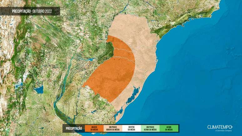 Outubro: volume de precipitação abaixo da média no centro-oeste e sul do Paraná, planaltos norte e sul e serra de Santa Catarina, norte, centro e leste do Rio Grande do Sul; precipitação dentro a abaixo da média nas demais áreas da Região Sul.
