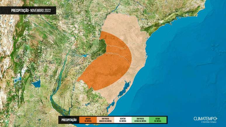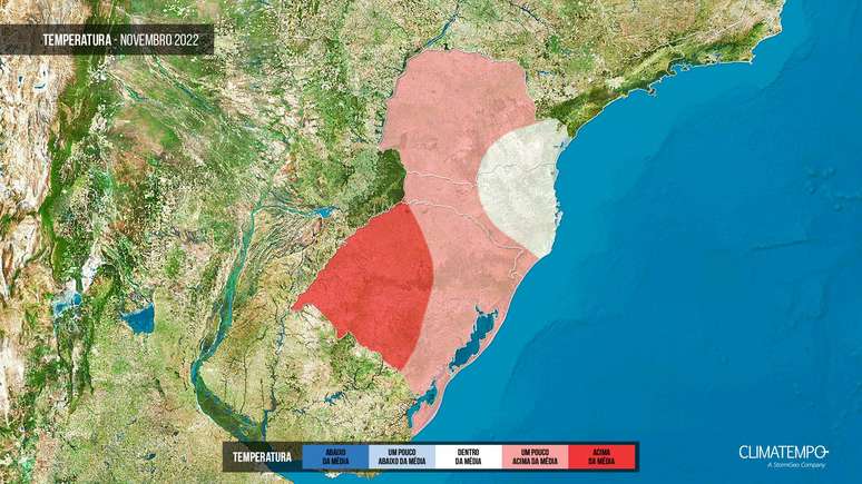 Novembro: volume de precipitação um pouco abaixo e abaixo da média climatológica, de forma geral; temperatura um pouco acima ou acima da média na maioria das áreas da Região Sul.