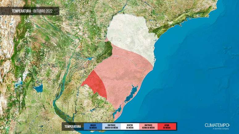 - os tons de vermelho indicam temperatura acima (vermelho escuro) da média normal ou um pouco acima (vermelho claro) da média climatológica mensal; os tons de azul representam temperatura abaixo (azul escuro) da média normal ou um pouco abaixo (azul claro) da média climatológica mensal; tom cinza claro indica temperatura próxima da média climatológica mensal.