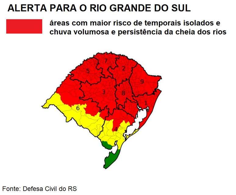 No momento, a Defesa Civil do Rio Grande do Sul informa que a condição é de alerta para o estado.