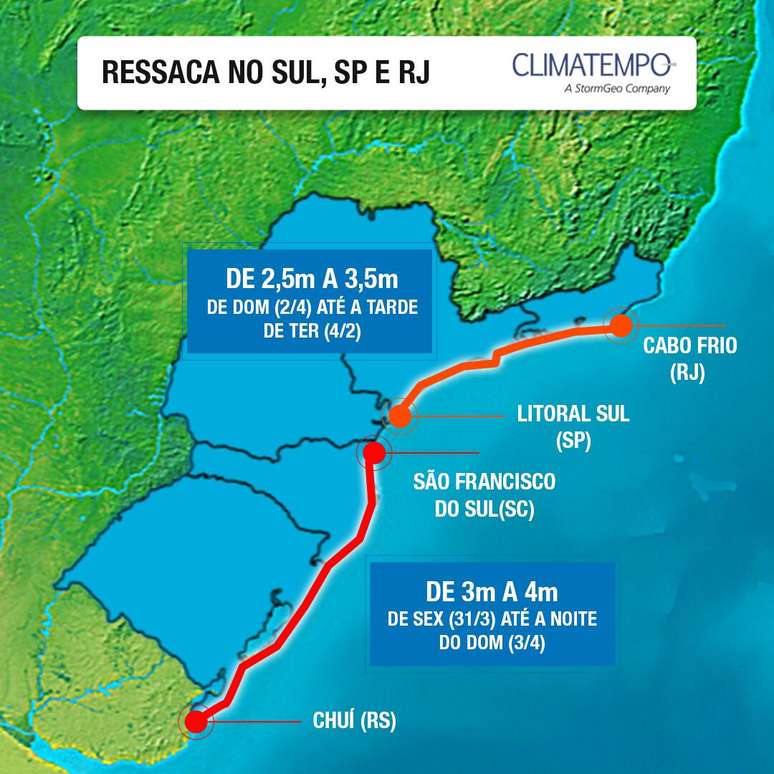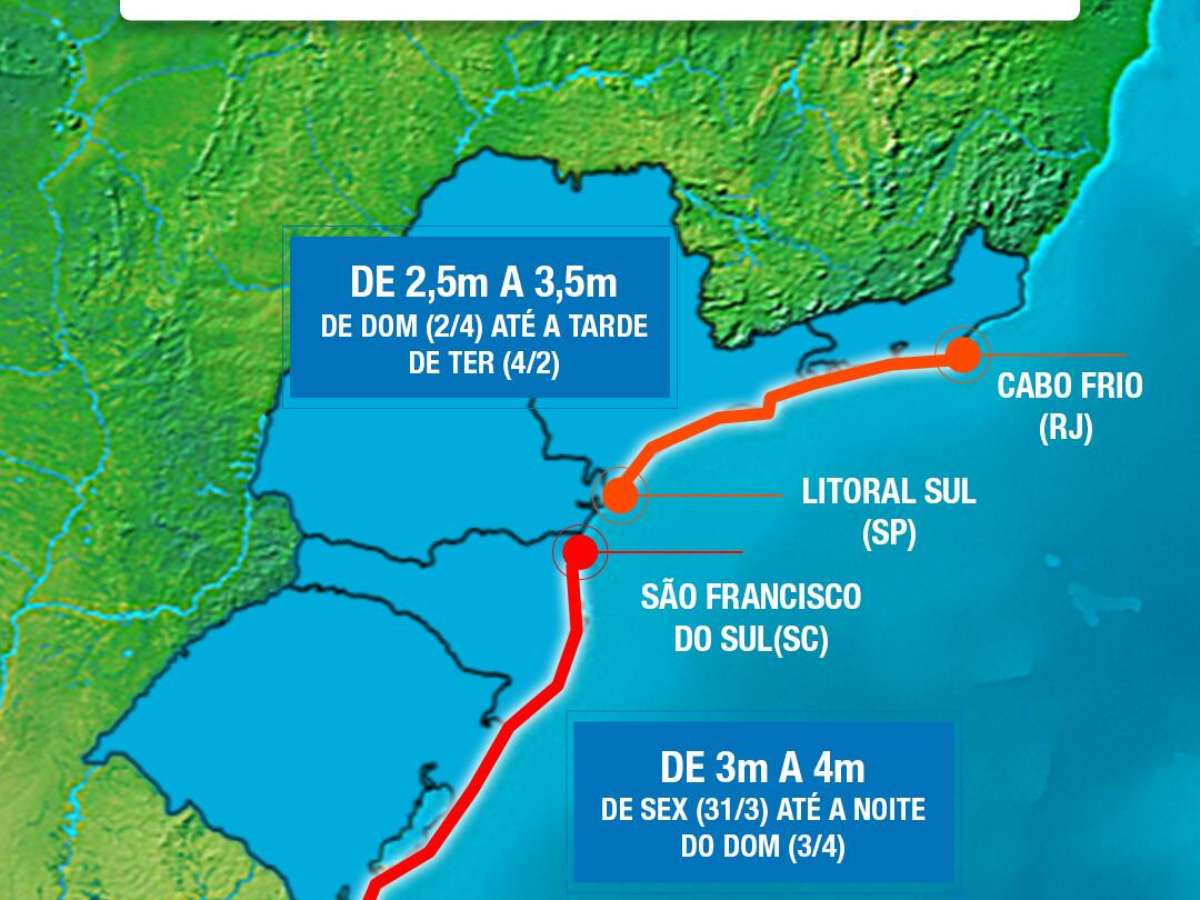 Ressaca no litoral de São Paulo e Rio de Janeiro: de 2,5 a 3,5m desde o domingo (02) até a tarde de terça (04), sendo mais intenso entre domingo (02) e a segunda-feira (03).