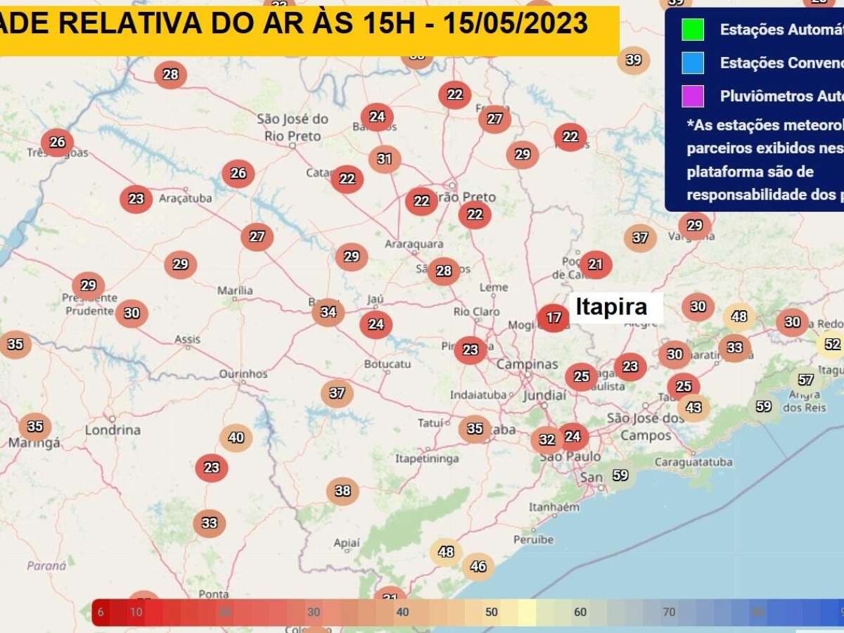 Ar seco em SP: umidade relativa do ar abaixo de até 17% em 15/5/2023 (Fonte: Inmet)