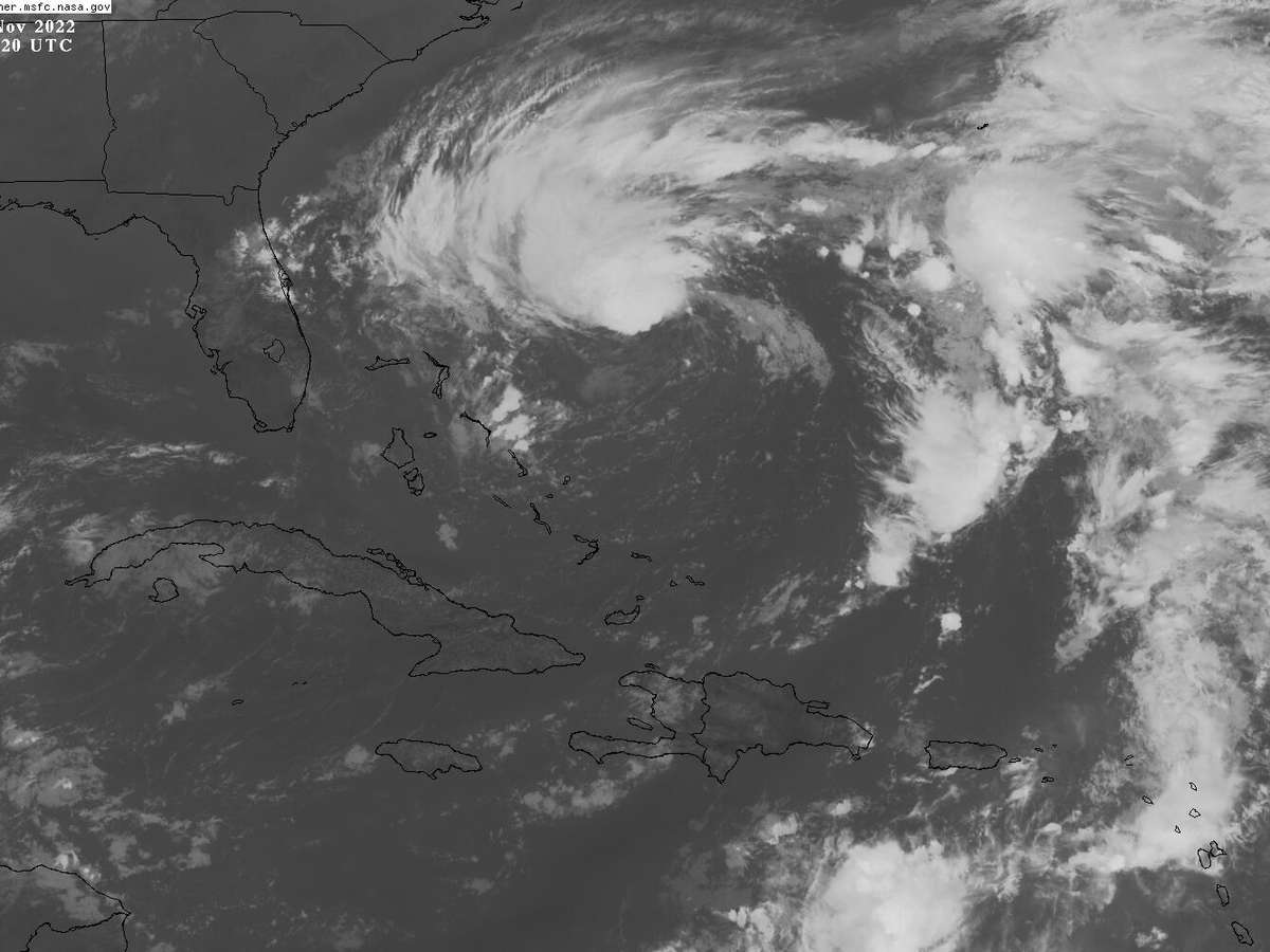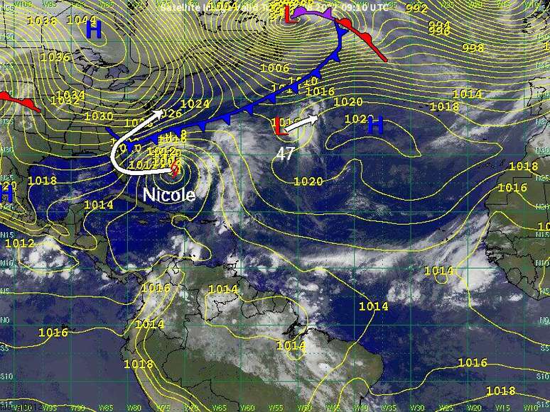 No Oceano Atlântico, próximo à Bahamas, atua uma tempestade subtropical de nome Nicole, que sustenta uma velocidade do vento de 74km/h.