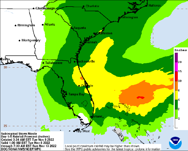 Nicole traz já chuvas intensas nas ilhas das Bahamas nesta terça e até o final do dia forma mais instabilidades pelo sudeste e sul da Flórida. Já entre quarta e quinta-feira (10) a chuva seguirá torrencial em Bahamas e também ocorrerá sobre toda a Flórida. Pois, a Nicole, como furacão, já atinge a região do sul dos Estados Unidos.