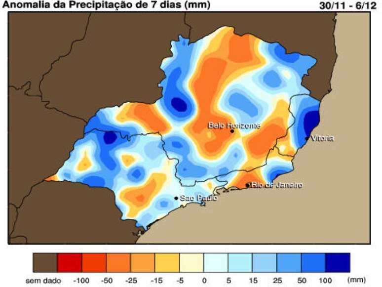 E a partir do dia 12 de dezembro a situação fica ainda mais crítica. Isso porque os volumes acumulados podem passar dos 130mm no período de 12 a 16 do mês em todo o estado capixaba. Na Bahia, neste mesmo período, o volume de chuva ficará na casa dos 70mm.