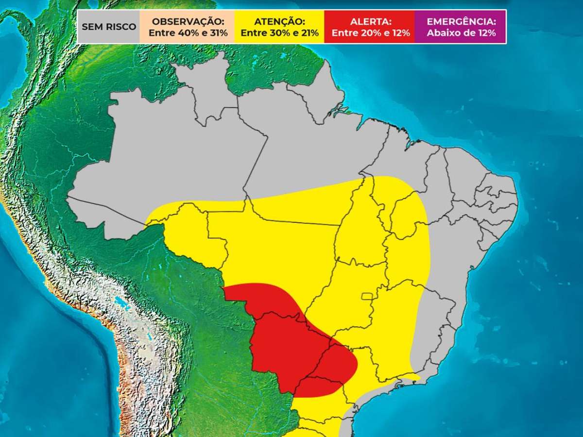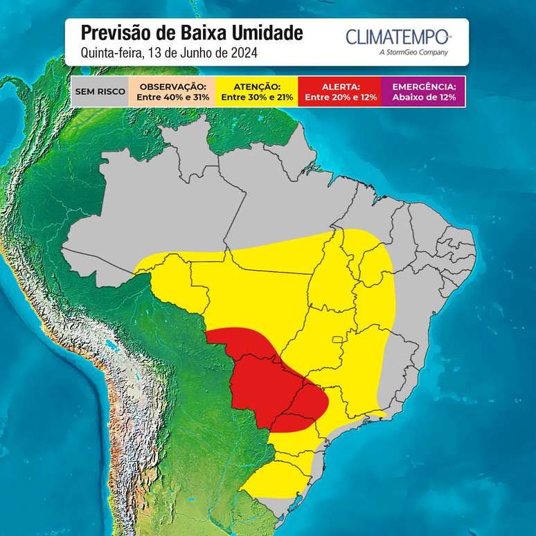 Em alguns estados brasileiros, a umidade relativa do ar atingiu valores de alerta (11% a 20%) na tarde da quarta-feira, 12 de junho.