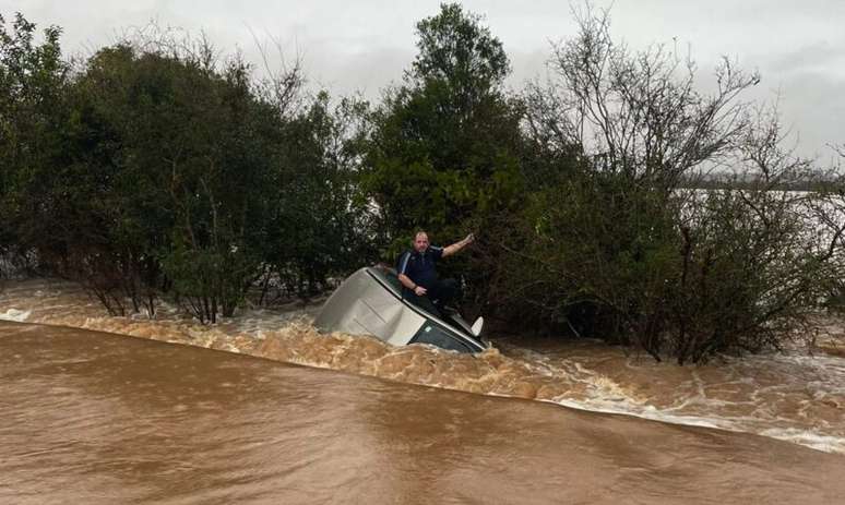Vídeo: Homem ilhado por 12 horas no teto do carro é resgatado por PRF de folga no RS