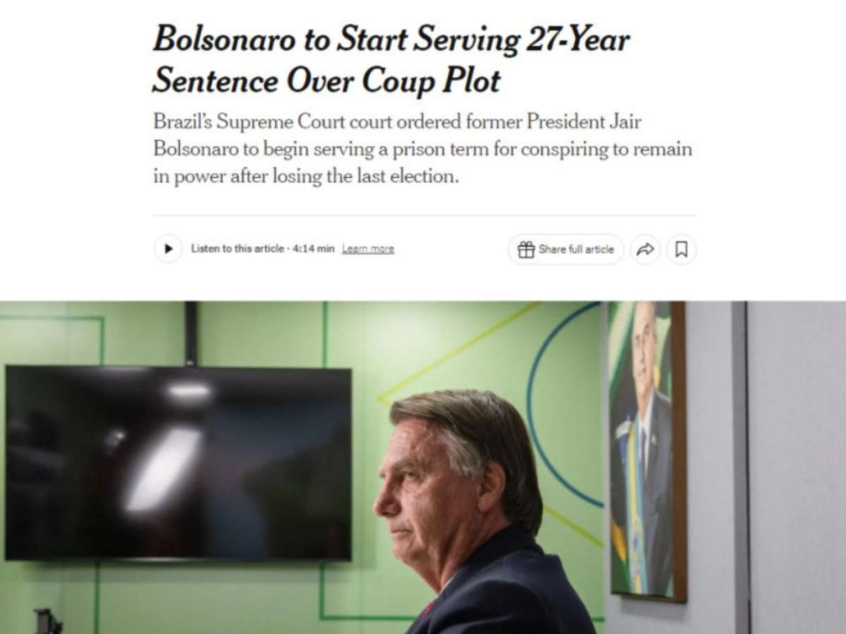 Gerou grande repercussão na imprensa internacional o destino do ex-presidente Jair Bolsonaro (PL). Jornais ao redor do mundo noticiaram o fim do processo do plano de golpe e o início do cumprimento da pena.
