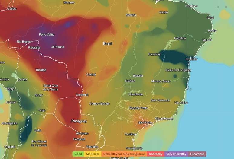 Figura 1 - Qualidade do ar em níveis extremos sobre boa parte do Brasil. Fonte: IQair