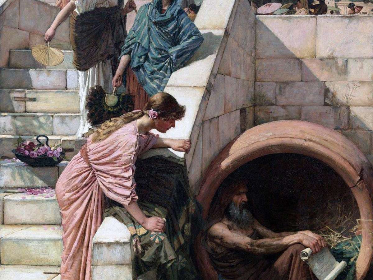Então, em vez de buscar fama e fortuna, ou pelo menos uma maneira de ganhar a vida para pagar por comida e abrigo, Diógenes fez sua casa nas ruas, dormindo ao ar livre, às vezes em um barril.