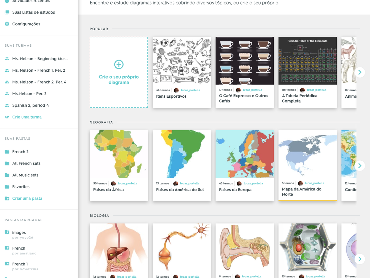Os Diagramas são simples de usar. Para construir uma nova lista de estudos, basta carregar uma imagem (por exemplo, um mapa dos Estados Unidos) e, em seguida, inserir termos e definições correspondentes (ou seja, os 50 estados como os termos e suas capitais como as definições). Estudantes e professores também podem buscar os diagramas mais populares ou pesquisar os milhares já criados na Quizlet.