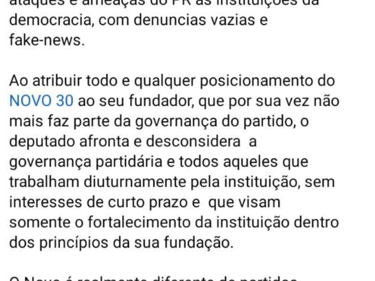 "Se a gente quiser transformar o Novo numa plataforma de terceira via viável, não dá para ficar quieto diante de tudo o que está acontecendo", disse. "Para isso, temos de ser tão oposição a este governo que está aí quanto fomos ao PT, pela forma como ele atua, atacando instituições, gerando instabilidade, não cumprindo com tudo o que prometeu na campanha."