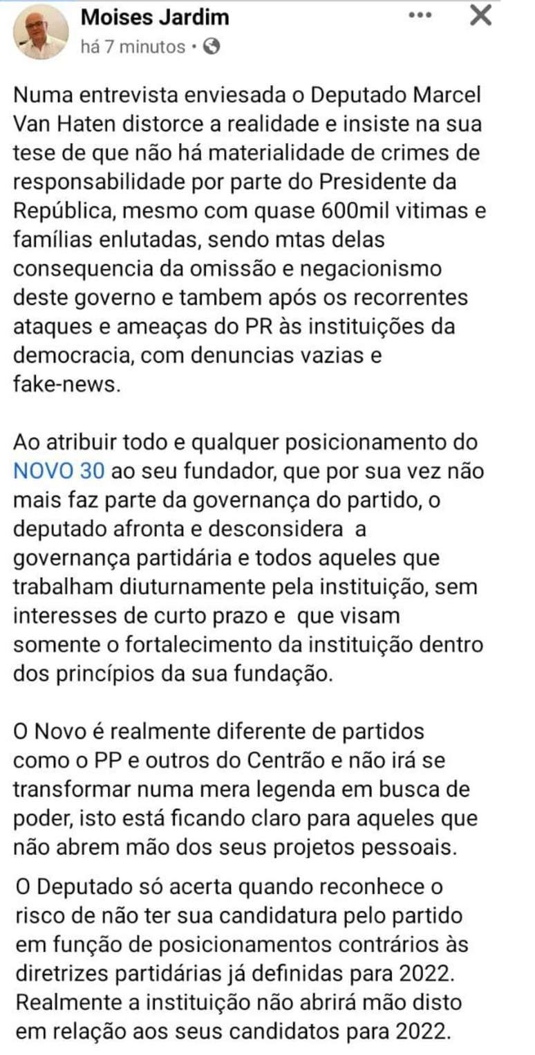 Em publicação feita só para amigos no Facebook na segunda-feira, 20, à qual o Estadão teve acesso, o tesoureiro do Novo, Moisés Jardim, um dos seis integrantes do Diretório Nacional, criticou duramente o deputado federal Marcel van Hattem (Novo-RS), por se colocar contra as decisões do partido, defendidas por seu fundador, João Amoêdo, de apoio ao impeachment do presidente Jair Bolsonaro e adoção de uma postura de oposição ao governo.