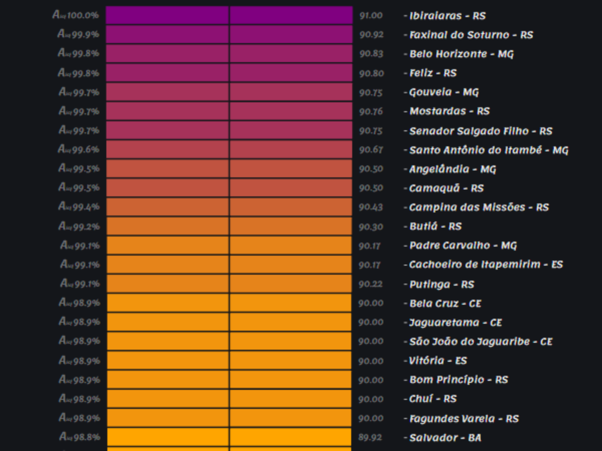 Além de Minas Gerais, as cidades de outros 4 estados - Bahia, Ceará, Espírito Santo e Rio Grande do Sul - compõem o Top 25 Nacional do Ranking da Qualidade da Informação Contábil e Fiscal de 2022. No ano anterior, 21 das 25 cidades eram do Rio Grande do Sul. Na listagem atual, Belo Horizonte (MG) se destaca com a melhor colocação entre as capitais do Brasil. Outros 4 municípios mineiros integram o ranking dos melhores colocados, com Gouveia em 5º lugar. A representação do estado nesse grupo passou de 4% para 20% neste ano.
