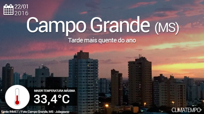 Já em Mato Grosso do Sul, a falta de nuvens nos últimos garantiu muitas horas com sol forte e o ar esquentou muito. A tarde de 22 de janeiro foi a mais quente do ano até agora em Campo Grande, capital do estado. Por causa da pouca nebulosidade à noite, a madrugada do dia 19 foi a mais fresca do ano.