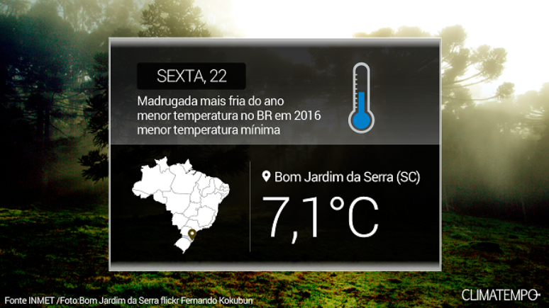 Mas por causa da falta de nuvens durante a noite, com o ar seco predominando sobre o Sul do Brasil, esfriou mais na serra catarinense. Em Bom Jardim da Serra, a temperatura na madrugada do dia 22 foi de 7,1°C. Esta agora é a menor temperatura registrada em 2016 no Brasil. O recorde anterior era de 9,2°C em Nova Friburgo (5/01) e em Bom Jardim da Serra (21/01).