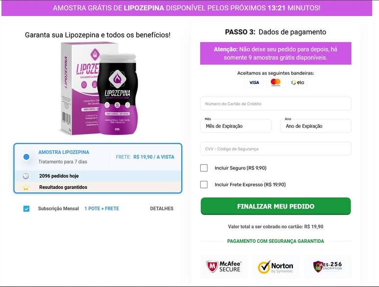 No texto, ela encontrou o link para um site onde é possível fazer uma "assinatura experimental" para obter "amostras grátis" — mediante o pagamento, por cartão de crédito, de R$ 19,90 de frete. Ela aceitou a condição e digitou os dados apressadamente, para não perder a oferta, limitada por uma contagem regressiva no topo da tela. "Pegue sua amostra grátis disponível somente pelos próximos minutos e faça como as milhares de mulheres que têm emagrecido com lipozepina!"