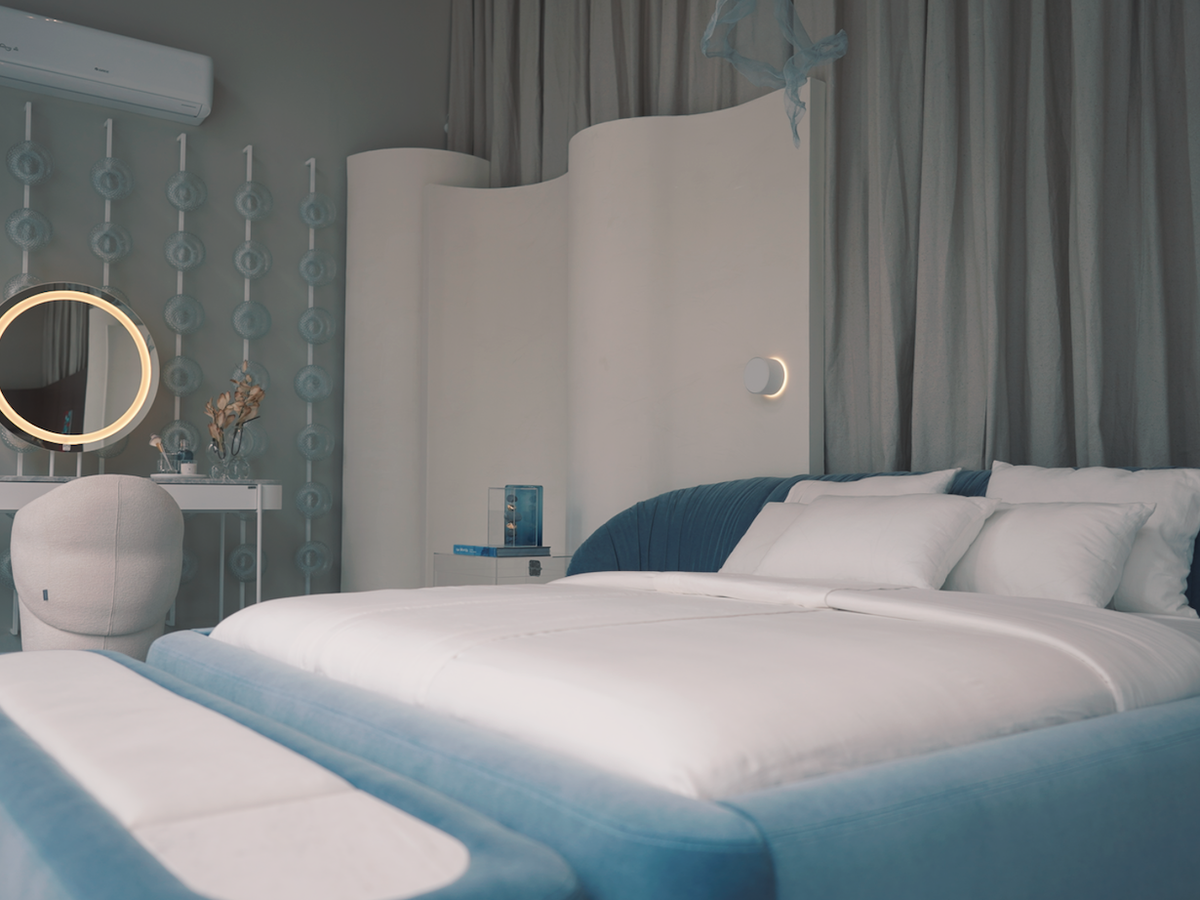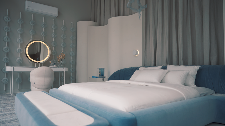 O projeto parte da ideia de representar a água como origem e repouso, com uma cama em tons de azul que ocupa posição central no espaço. O ar, associado ao movimento e ao caráter invisível, é trabalhado em uma escultura suspensa que se integra ao ambiente. "A ideia foi criar um espaço que sugere a passagem do tangível ao intangível", afirma Stéphanie Lucchese Borsatto, arquiteta da we.arch responsável pelo projeto.