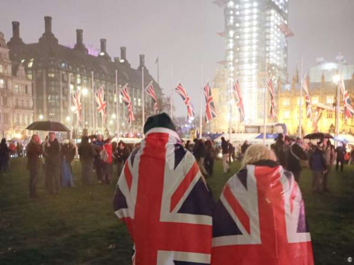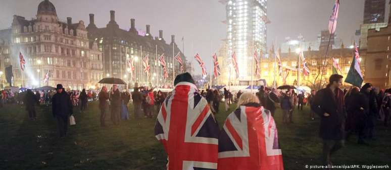 Brexit encerra casamento de 47 anos. Milhares de britânicos se reúnem para celebrar o divórcio. Boris Johnson anuncia começo de "nova era".O Reino Unido deixou nesta sexta-feira (31/01) oficialmente a União Europeia, encerrando uma relação de 47 anos. Milhares de apoiadores do Brexit se reuniram em frente ao Parlamento britânico em Londres para aguardar e celebrar esse momento histórico. Alguns chegaram a queimar uma bandeira do bloco europeu.