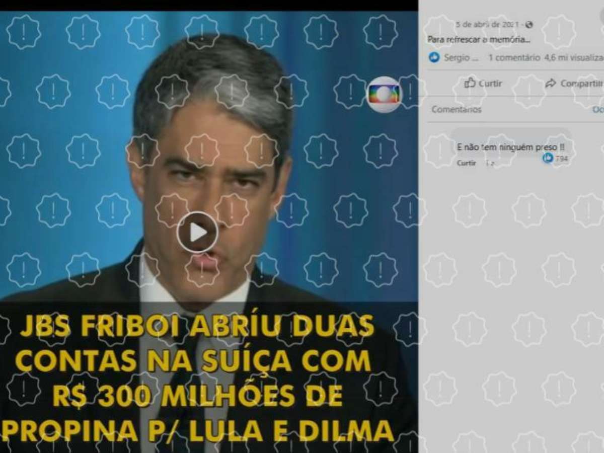 Postagens enganam ao tirar de contexto uma reportagem do Jornal Nacional, veiculada em maio de 2017, para afirmar que a JBS abriu contas na Suíça com R$ 300 milhões de propina em nome dos ex-presidentes petistas Luiz Inácio Lula da Silva e Dilma Rousseff, o que nunca foi confirmado (veja aqui). A denúncia consta na delação premiada de Joesley Batista, um dos donos da empresa global do ramo de proteínas, no âmbito da Operação Lava Jato, e não resultou em acusação formal por falta de provas.