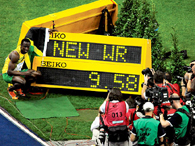Na final da prova dos 100 m do Mundial de Berlim, jamaicano Usain Bolt conquista ouro e bate recorde mundial - que já era dele. Corredor cravou os inéditos 9s58, superando a marca de 9s69 obtida em Pequim
